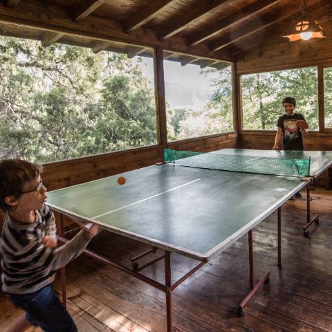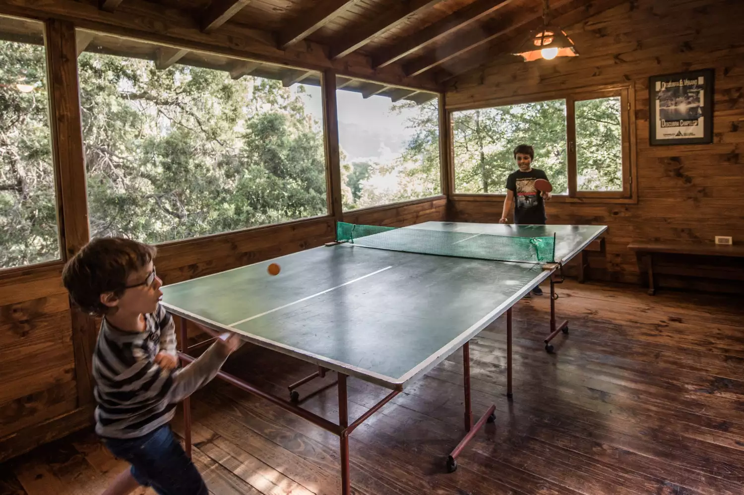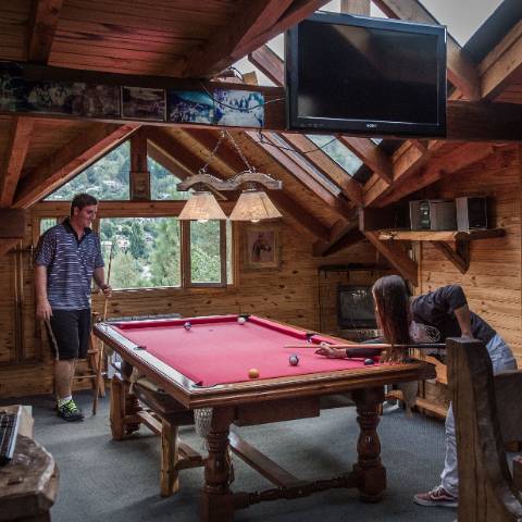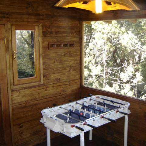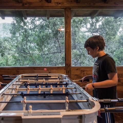 Sala de juegos con metegol, ping-pong, juegos de mesa y gimnasio.